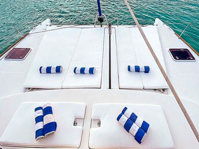 Step aboard the 40’ lagoon catamaran and sail into a sea full of adventure. This boat is equipped with a big cushioned sundeck in which everyone will be able to take the sun…