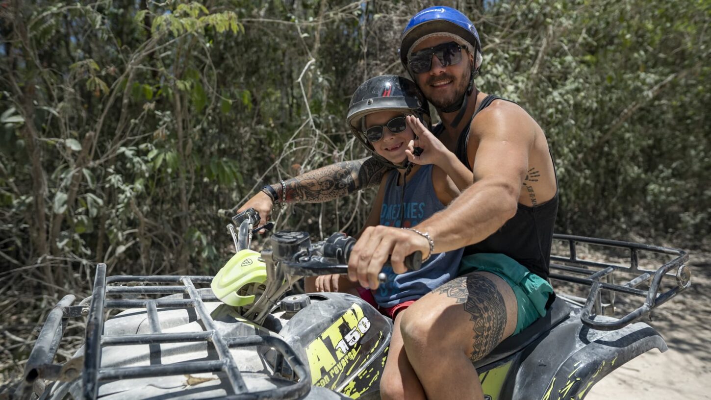 Calling all adrenaline junkies! Are you ready to go ziplining in Tulum? This is one of our very best Tulum tours and one of the coolest things to do in Tulum. You will love this cenote with zipline tour! There is no need to do an ATV Tulum rental, because this fantastic excursion has it all and is one of the best Tulum ATV tours available, with a dip in the mystical waters of a cenote, a Tulum zipline, and more. First, hop onto single or double ATVs and drive into the rainforest jungle to four zip lines, one of which is the longest in the Riviera Maya and a super fun one that lands in the water. Time to soar above the jungle canopy and get that blood pumping!
