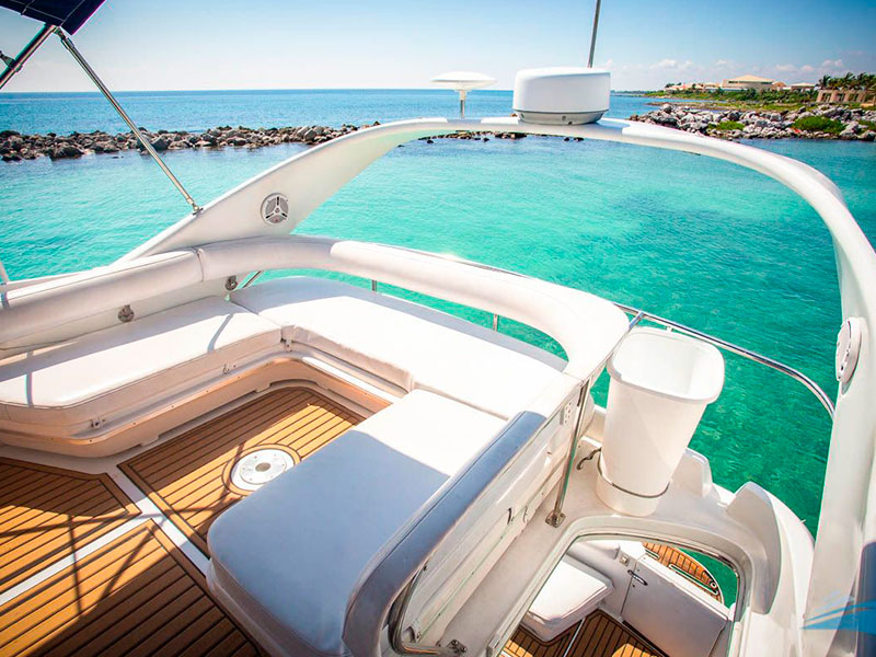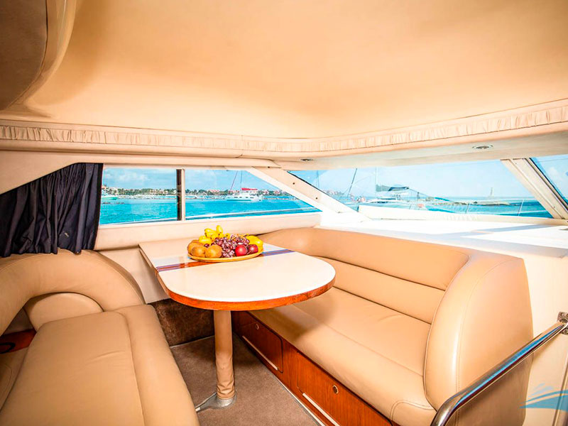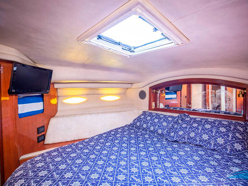 It features plenty of shaded seating areas at the back of the yacht where you will get to enjoy our open bar, a delicious guacamole and ceviche and of course our Bluetooth speaker system. It also includes a nice indoor section where you will be able to enjoy some air conditioning if you ever get tired of the heat, here we have a large kitchen, 1 bedroom with 2 single beds and 1 bathroom.