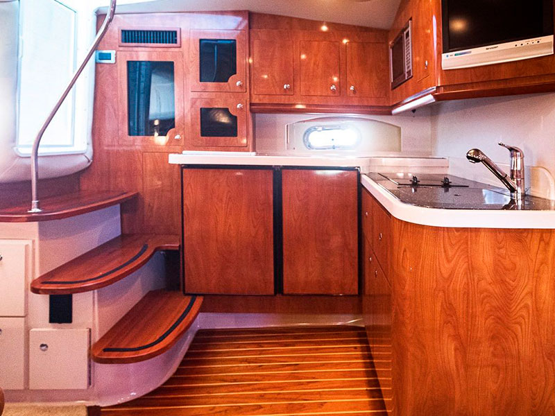 Below deck you will get to enjoy the living room area which has its own comfy sitting area, it is also equipped with air conditioning for those who get tired from the heat. It also has a queen sized bed, a bathroom with shower and a large kitchen.